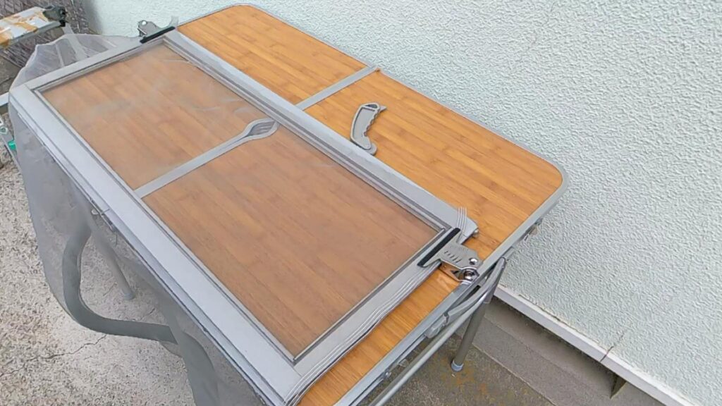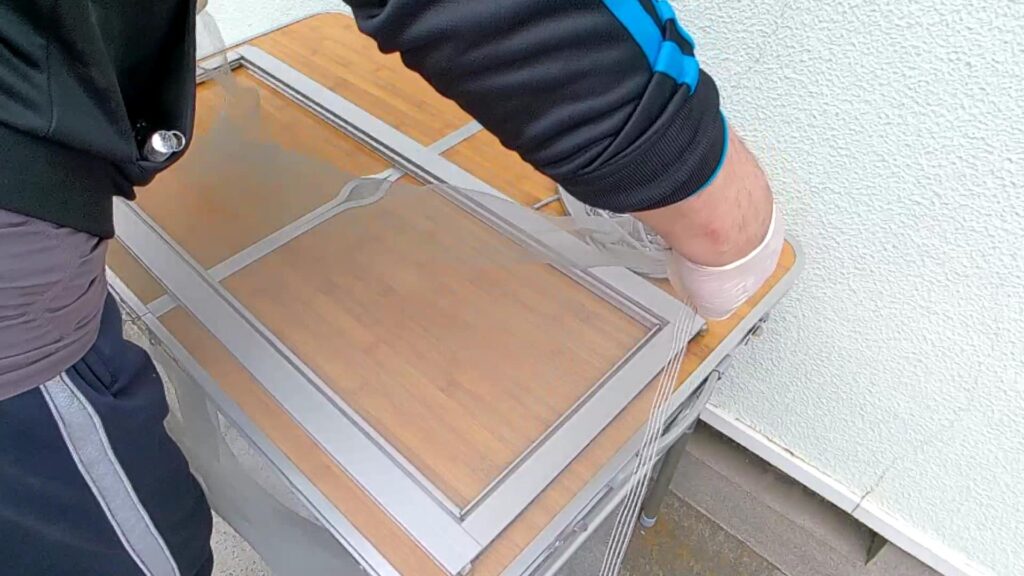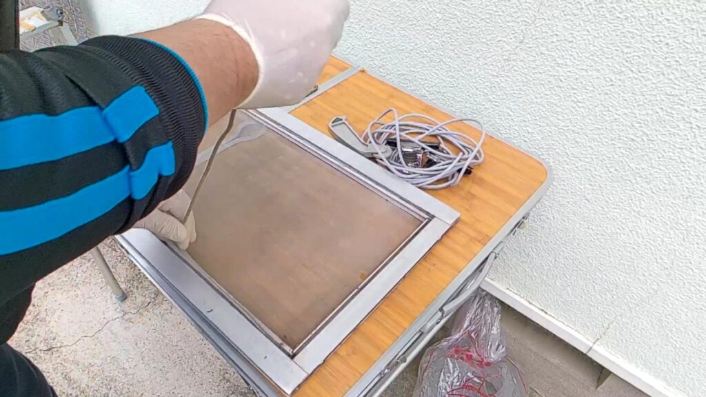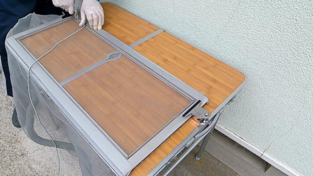 まずは、網を取り出して枠に合わせて防虫網(DAISO商品使用)を広げて