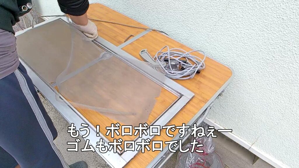 劣化した丸ゴム(網押さえコード)を外した瞬間にポロポロと崩れたように切れていく。
